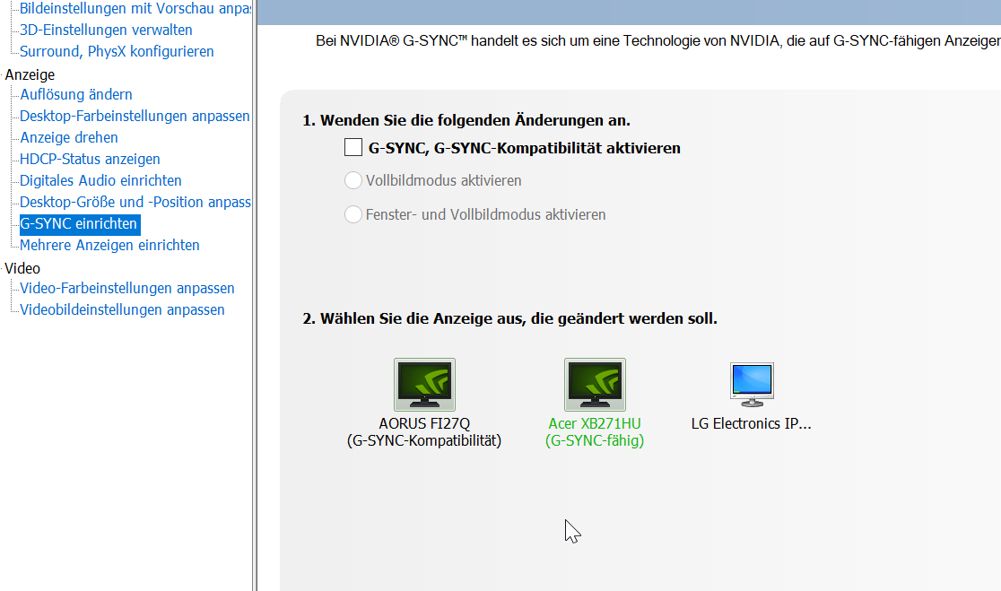 Ich möchte bei meinen alten Monitor (Acer XB271HU) das G-Sync deaktivieren, weil da das Module kaputt ist und es bei hohen Refresh Raten zum Flackern kommt.