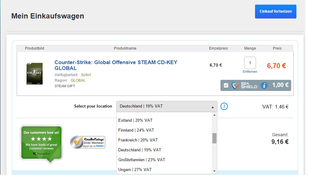 ich kann, wenn ich nun etwas bei G2A kaufen will nicht Deutschland als VAT Region auswählen nur Österech, Belgien, Bulgarien, die Kanaren, EU Ausland und Business.