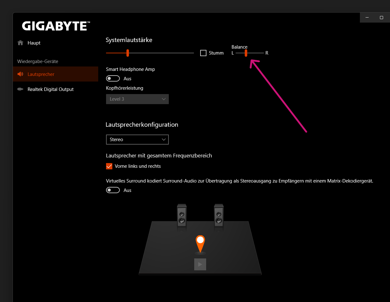 Die Balance ist bei mir unausgeglichen weil ein "Monitor" hinter dem Monitor steht. Also bekommt der verdeckte etwas mehr Power mit dem Balance Regler.