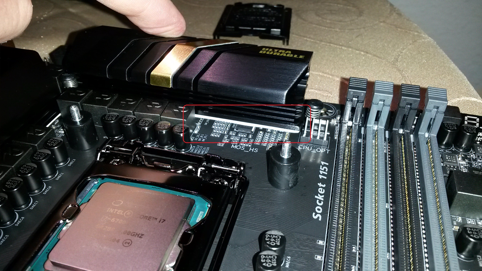 ich bin ganz leicht an den Mainboard Kühler für die Mosfets gekommen und habe fest gestellt, das der Kühler so gut wie kein Anpressdruck hat.