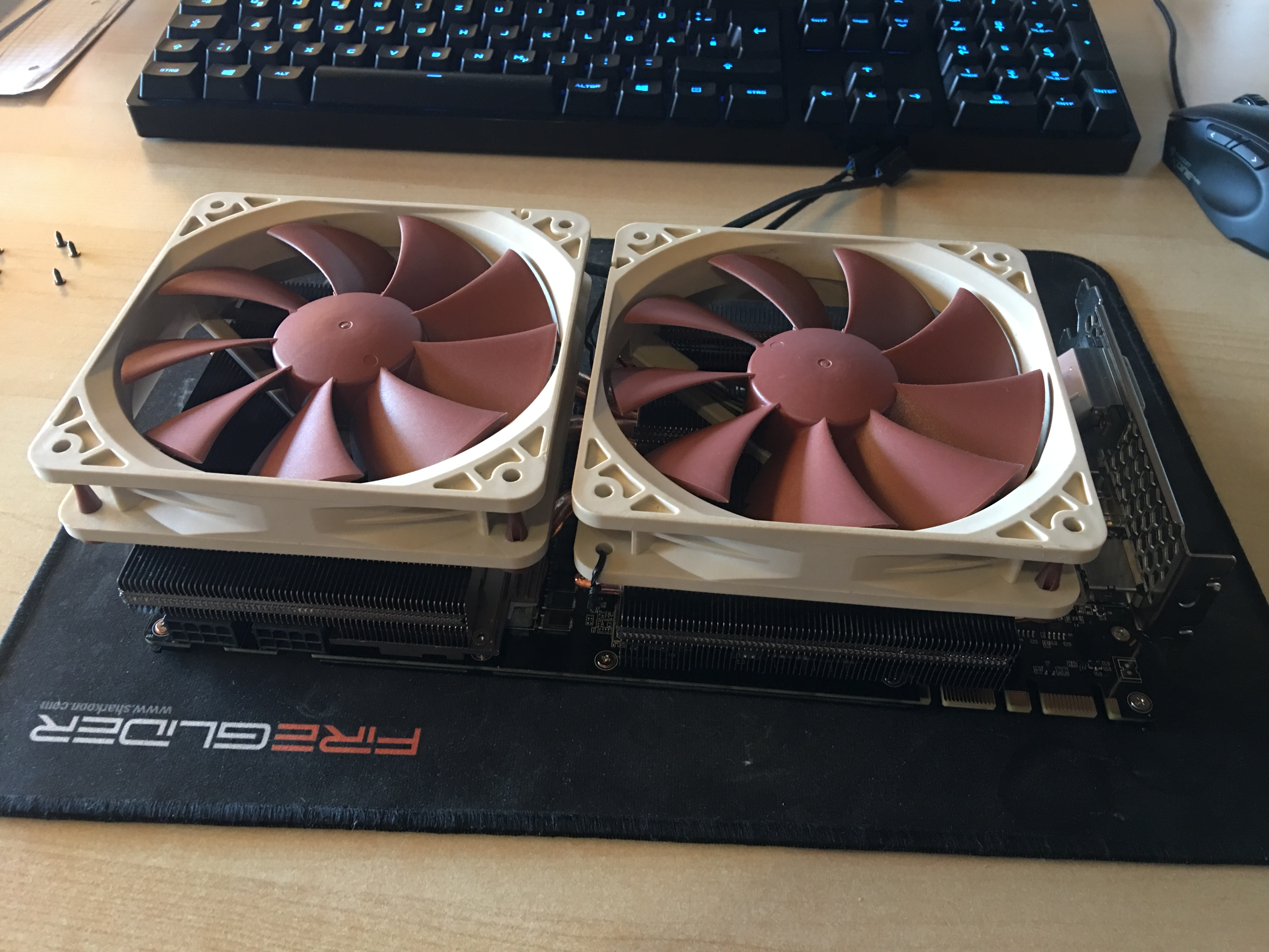 Jetzt hab ich die Lüfter am Mainboard angeschlossen und bei so ziemlich unhörbaren 1000 rpm fixiert.