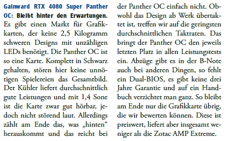 Die wenigen Bewertungen auf geizhals sprechen da eine ähnliche Sprache. Ob das nun eher subjektiv ist, oder tatsächlich ein Problem dieses Modells kann ich nicht beurteilen. Mich würde interessieren wie sich das bei der großen Schwester der 4080 Super Panther OC verhält, da der Kühler ja identisch zum kleinen Modell ist.