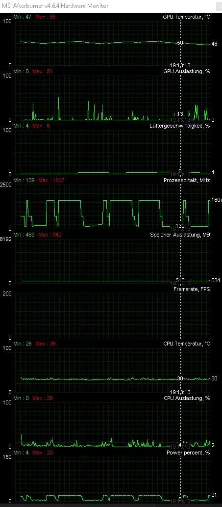 Desweiteren springt einer der zwei Lüfter immer an und versucht schnell zu drehen, geht dann aber sofort wieder aus. Das ist im Desktop Betrieb endlos und nervt. Im Afterburner wird FAN Speed 4% konstant angezeigt.
