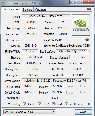 GPU: Gainward GTX 650 TI 1024MB