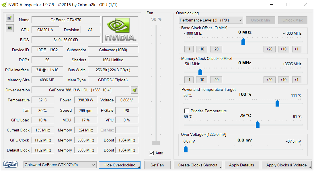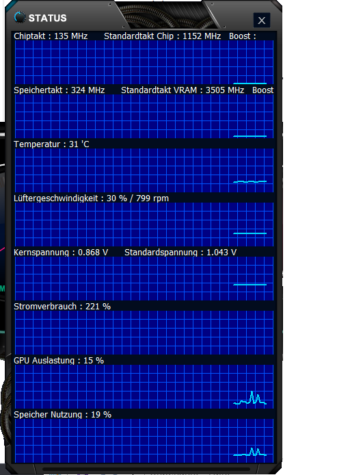 seit dem letzten Neustart meines PC taktet meine Gainward Phantom GTX 970 nicht mehr hoch sondern bleibt auf Chiptakt 135 MHz und Speichertakt 324 MHz bei einer Temperatur von 31 Grad. Die Lüfter laufen bei ca. 800 RPM. Stutzig macht mich die Anzeige des Stromverbrauch im Gainward Experttool. Kernspannung 0,868 V Standardspannung 1.0432V und einen Stromverbrauch von 221 % Kann es sein das hier eher ein Problem des Netzteiles vorliegt oder ist es wohl doch eher die Grafikkarte? Bin Ratlos und für Hilfe dankbar. Alles andere am PC funktioniert in gewohnter Weise, nur wenn Grafikleistung gefordert ist geht nicht mehr viel und es kommt natürlich zu FPS-Einbrüchen. Gruss Marco