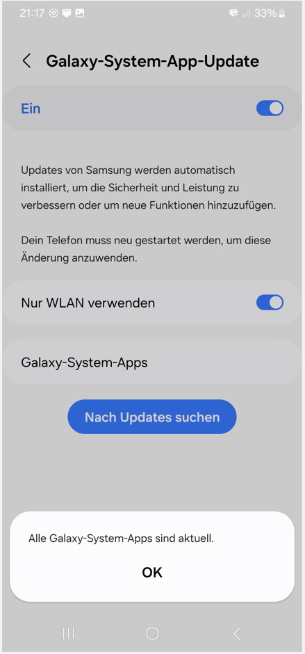 Das Handy war bei der Ersteinrichtung letzten Sommer ein einziges Mal im WLAN ("Zuletzt überprüft am 27. Juli 2024"). Kann es sein, dass es einfach noch kein Update gibt oder lässt sich ein solches Update nur über WLAN/mobile Daten herunterladen? Komisch aber, dass Internet/Play Store/Galaxy Store etc. mit dem Adapter problemlos funktioniert ... Oder brauche ich zusätzlich zum Gugl-Konto noch ein Samsung-Konto für Updates?