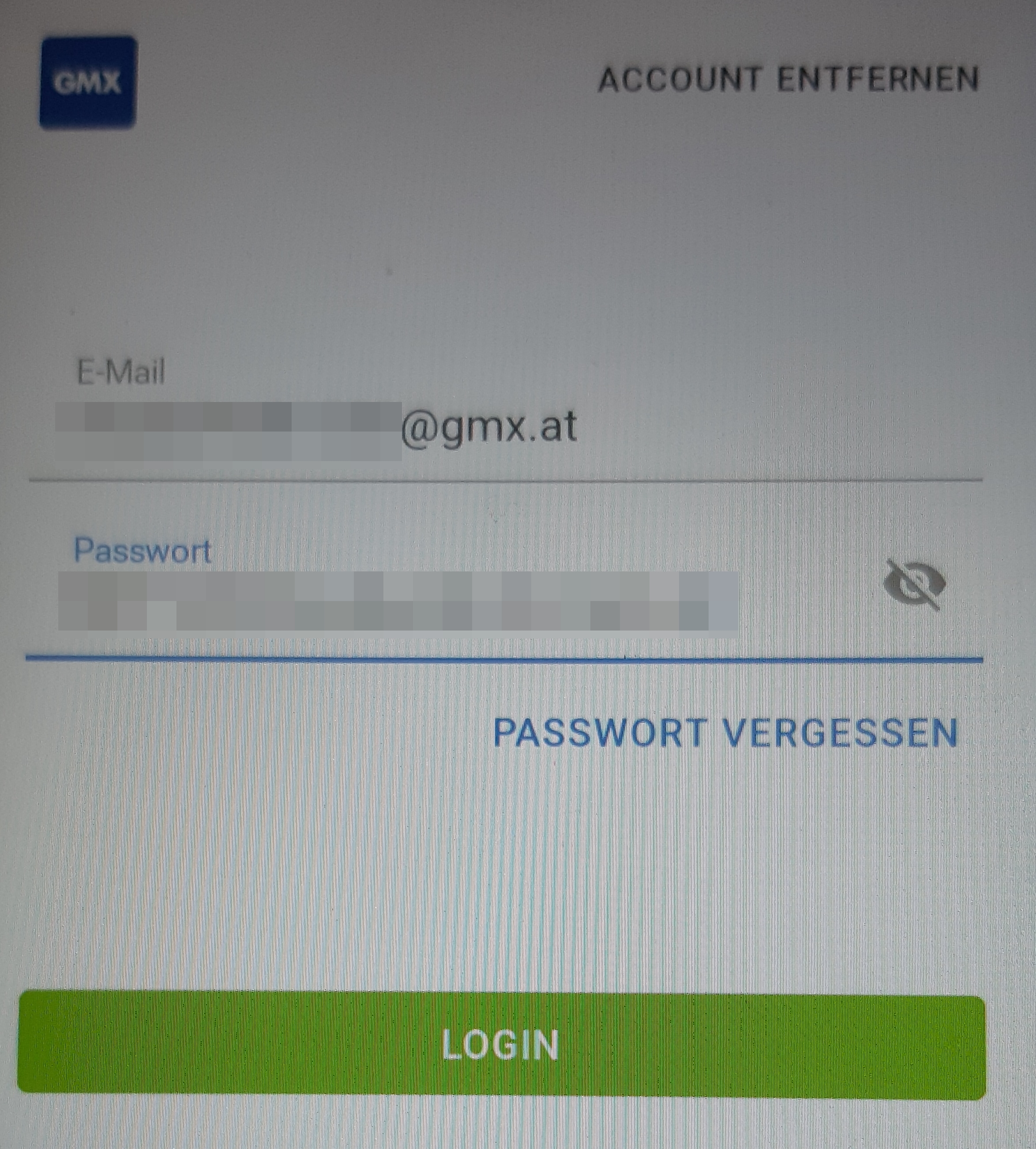Schlussendlich: Anmeldung am PC auf der gmx-Website. Dort hat alles bestens funktioniert – gleiches Mail-account und gleiches Passwort.