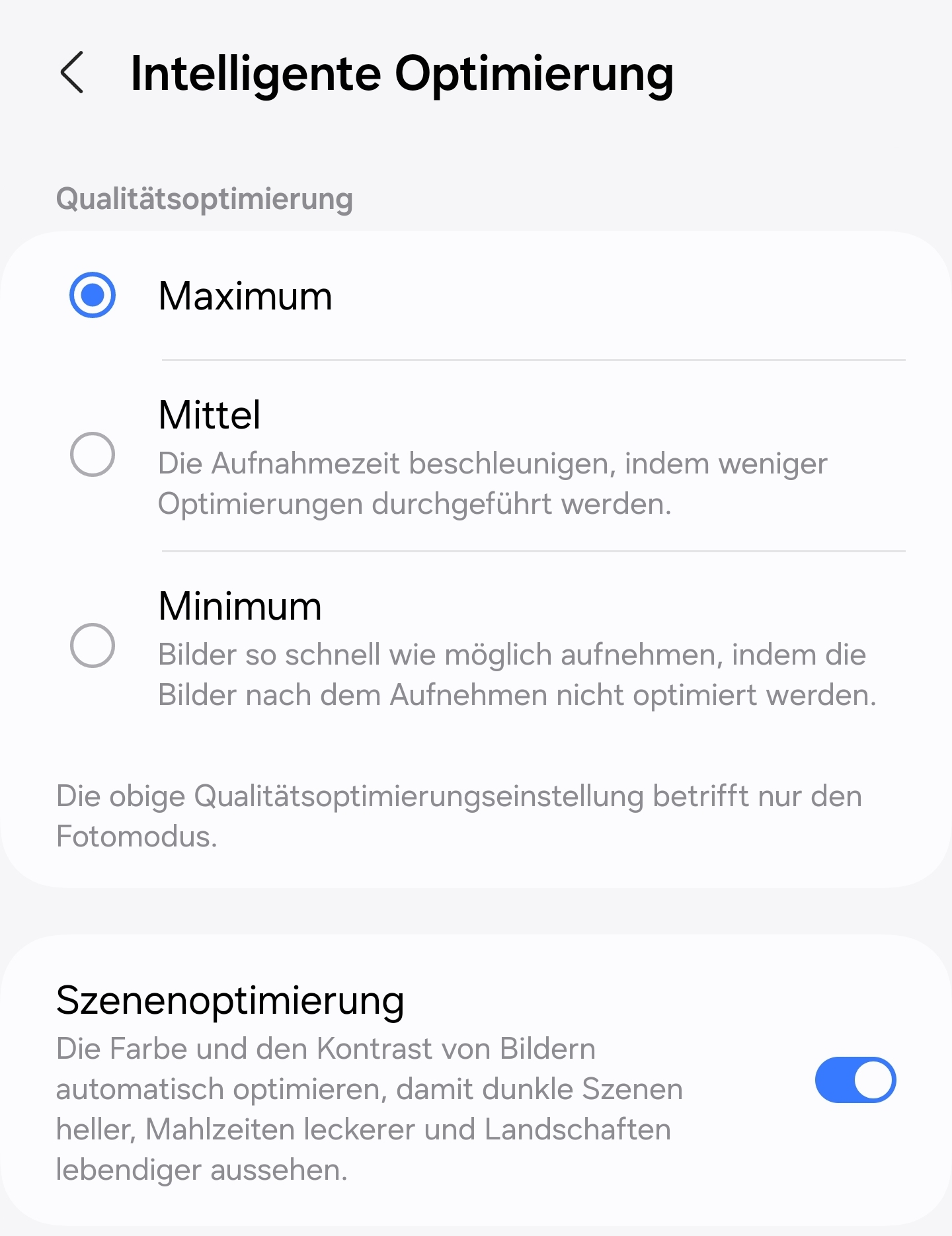 Ich bin/war der Meinung aufgrund der Fotos, dass die Szeneoptimierung man genau wegen der Qualität besser ausgeschaltet lässt, eigentlich gehört diese gesamte Intelligente Optimierung komplett überarbeitet bzw. sollte sie komplett auschaltbar sein, sonst wird das echt nichts mehr mit dem S24.
