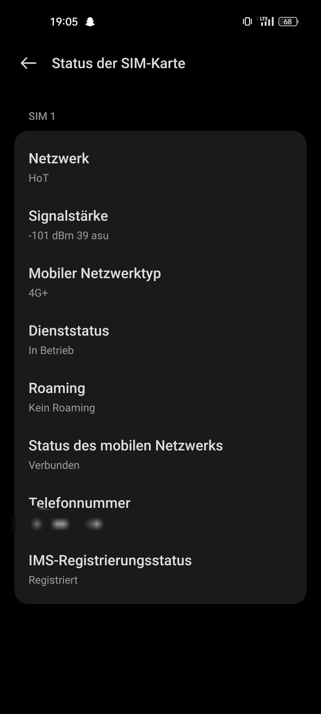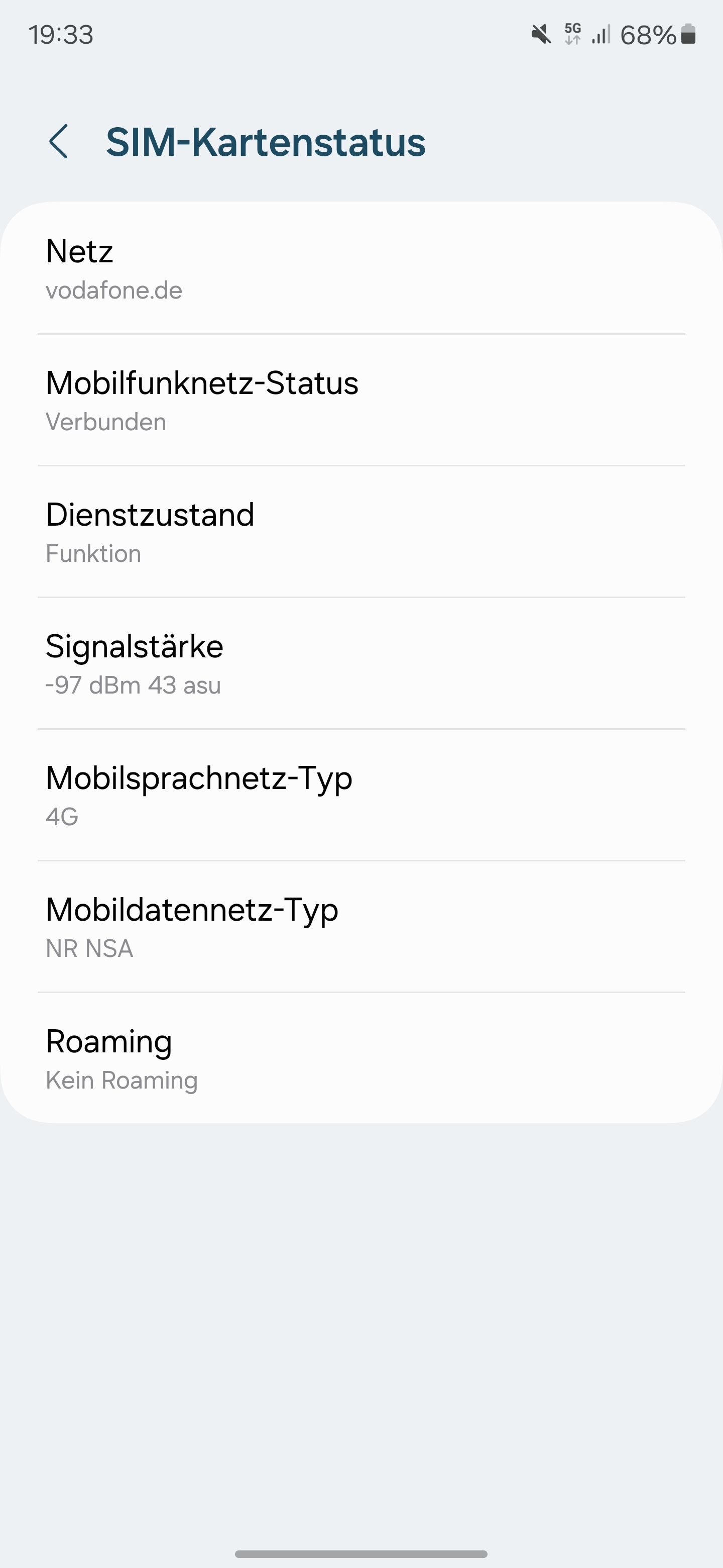 Guck mal oben rechts auf meinen Empfang. Sowas hatte ich wirklich noch nie. Ich habe hier ausgezeichnetes Netz und wenn ich das andere Handy über die Esim wieder aktiviere, hat dies an der gleichen Stelle vollen Empfang, auch mit anderen Geräten war es nie anders.