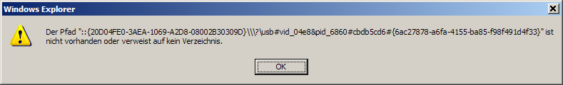 Seit kurzem erscheint zwar noch das Auswahlfenster ("Gerät zum Anzeigen der Dateien öffnen mit Windows Explorer"/"Digitale Mediendateien mit Gerät synchronisieren" etc.), wenn ich dann aber versuche, über die 1. Auswahloptioin ein Explorer-Fenster zu öffnen, kommt eine Fehlermeldung "Der Pfad ... ist nicht vorhanden oder verweist auf kein Verzeichnis" (s. Bild).