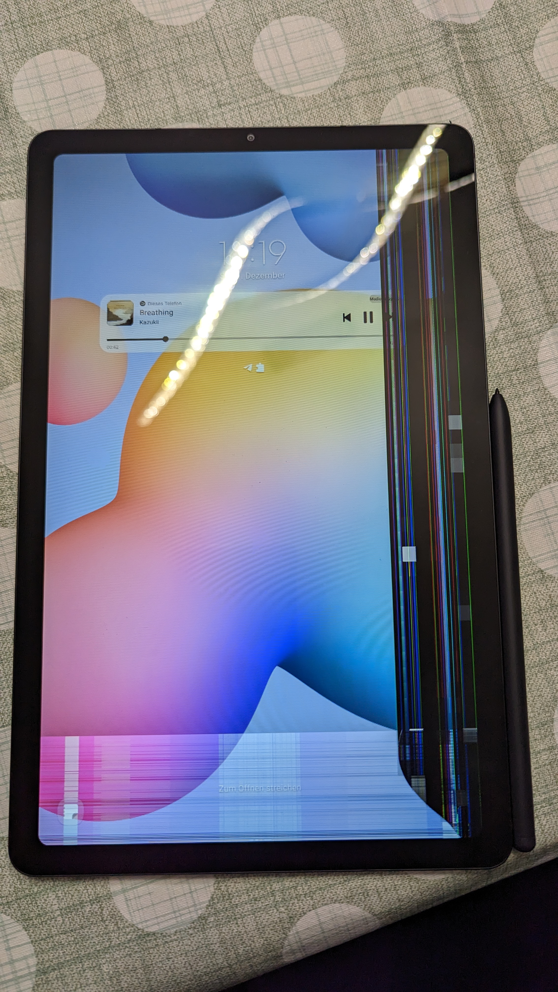 Ich war gerade am zeichnen mit dem S PEN. Das Tablet lag auf dem Tisch, dann reagierte es wieder nicht im unteren rechten Bereich auf den Stift. Also greife ich es am unteren rechten Rahmen um es hochzuheben da ich es neustarten wollte und zack. Nun sieht es so aus wie auf dem Bild.