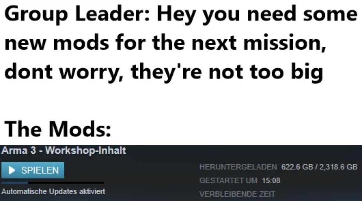 Ich habe mal vor 2 Jahren ein passendes Meme zu diesem Thema erstellt:Stock86 schrieb:Habe bisher fast nur Arma3 gemoddet, bzw. erweitert.
