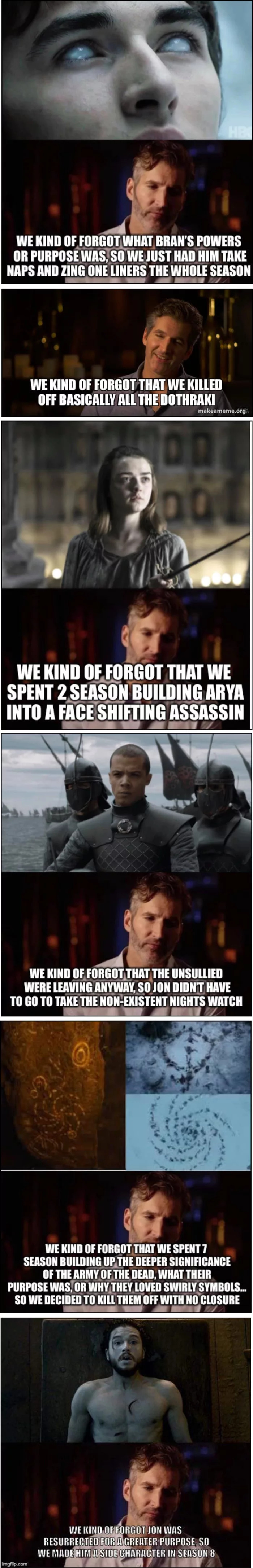 An der Stelle möchte ich mich aber bei den Schauspielern (wie z.B. Nikolaj Coster-Waldau, Ian McElhinney) bedanken, die seit JAHREN gehen den Bullshit von D&D ankämpfen, bzw. nun im Rahmen ihrer Möglichkeiten (Emilia Clarke, Joe Dempsie, Pilou Asbaek) Verständnis für die entrüsteten Fans zeigen und Sticheleien gegen die 8. Staffel setzen.