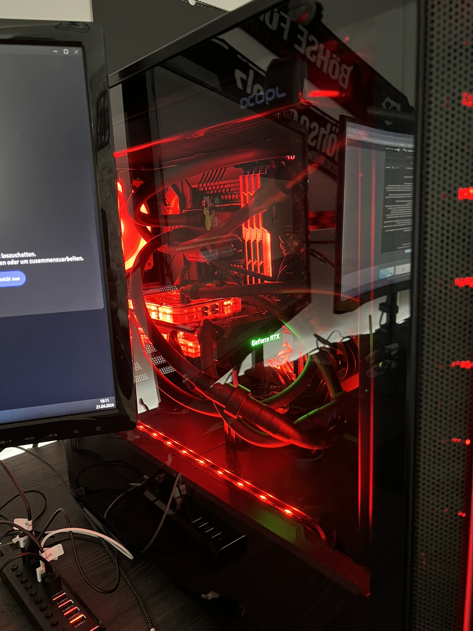 CPU & GPU sind wassergekühlt in einem Kreislauf mit 2x360mm Radiatoren & 2 pumpen, sowie aktiver Backplate für die GPU als Zusatz. Zusätzlich sind noch 2 weitere 120mm Lüfter im Gehäuse verbaut....