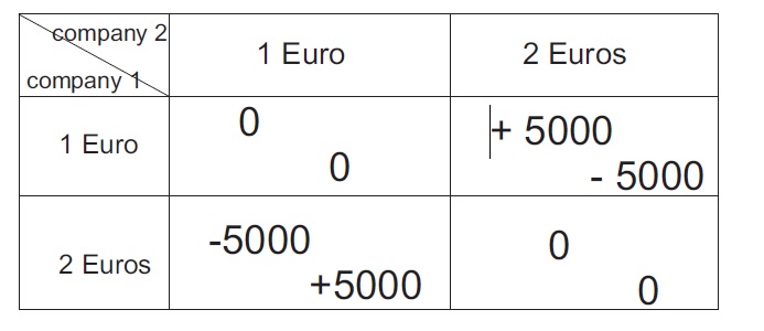 Game theory: Two competitors produce table water. They have to decide abouttheir price policy and have two options: To sell one bottle at the price of 1 Euro or