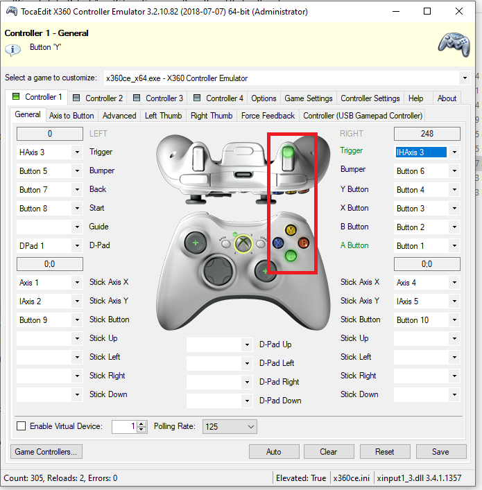 Seit einiger Zeit ist die A - Button Taste und die RT Taste gekoppelt. Ich hab keine Ahnung wie ich das Hinbekommen habe. Wenn man die A Taste drückt reagiert auch automatisch die RT (Z Achse) Taste mit.