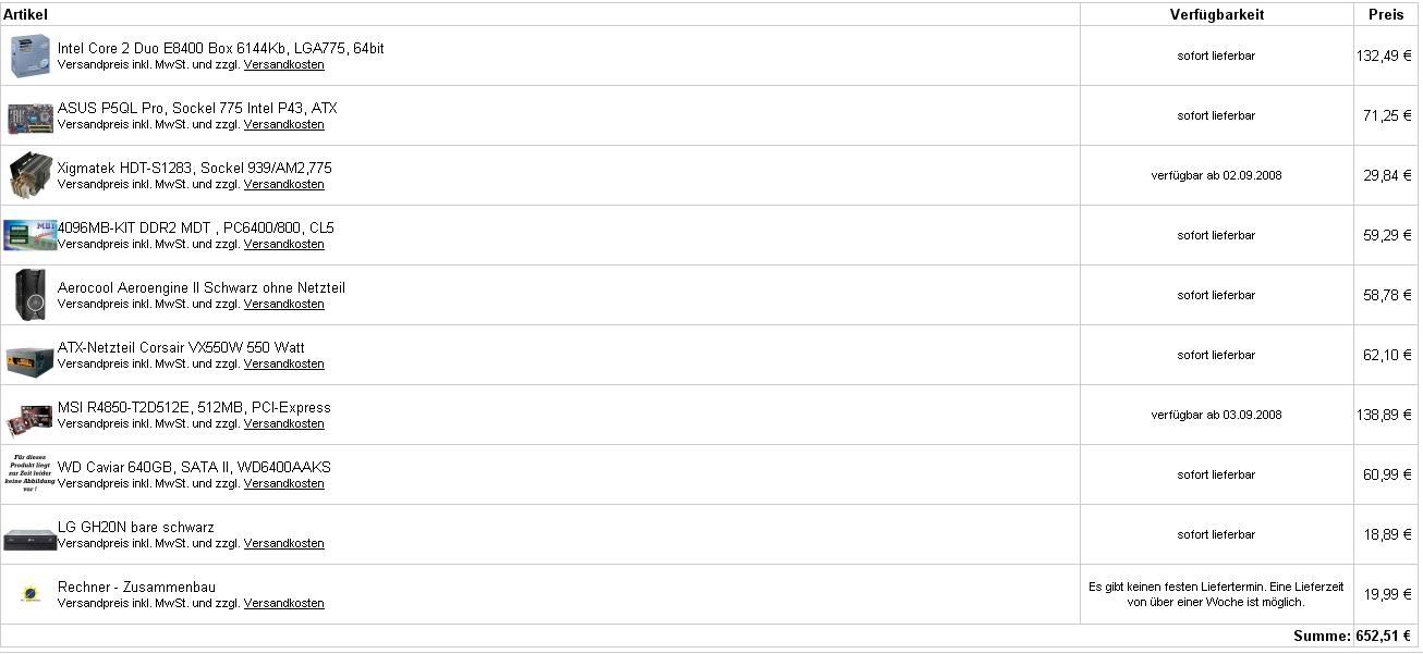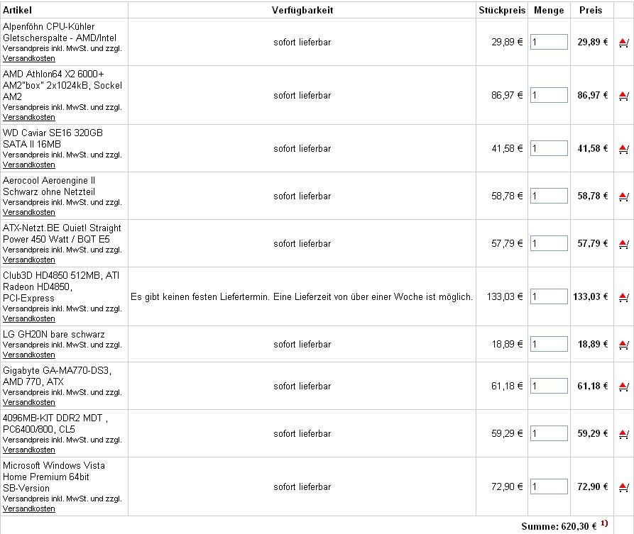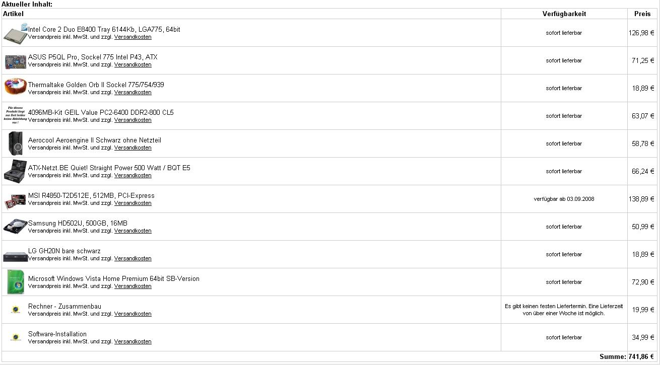 da mein jetziger Rechner schon 2 Jahre alt ist und nicht mehr die gewünschte Leistung bringt, habe ich mich entschlossen einen neuen zu bestellen. Von den vielen Komplett-Angeboten hat mir jedoch kein Rechner zu 100% zugesagt, weshalb ich mich entschlossen habe ihn mir bei hardwareversand.de zusammenbauen zu lassen.