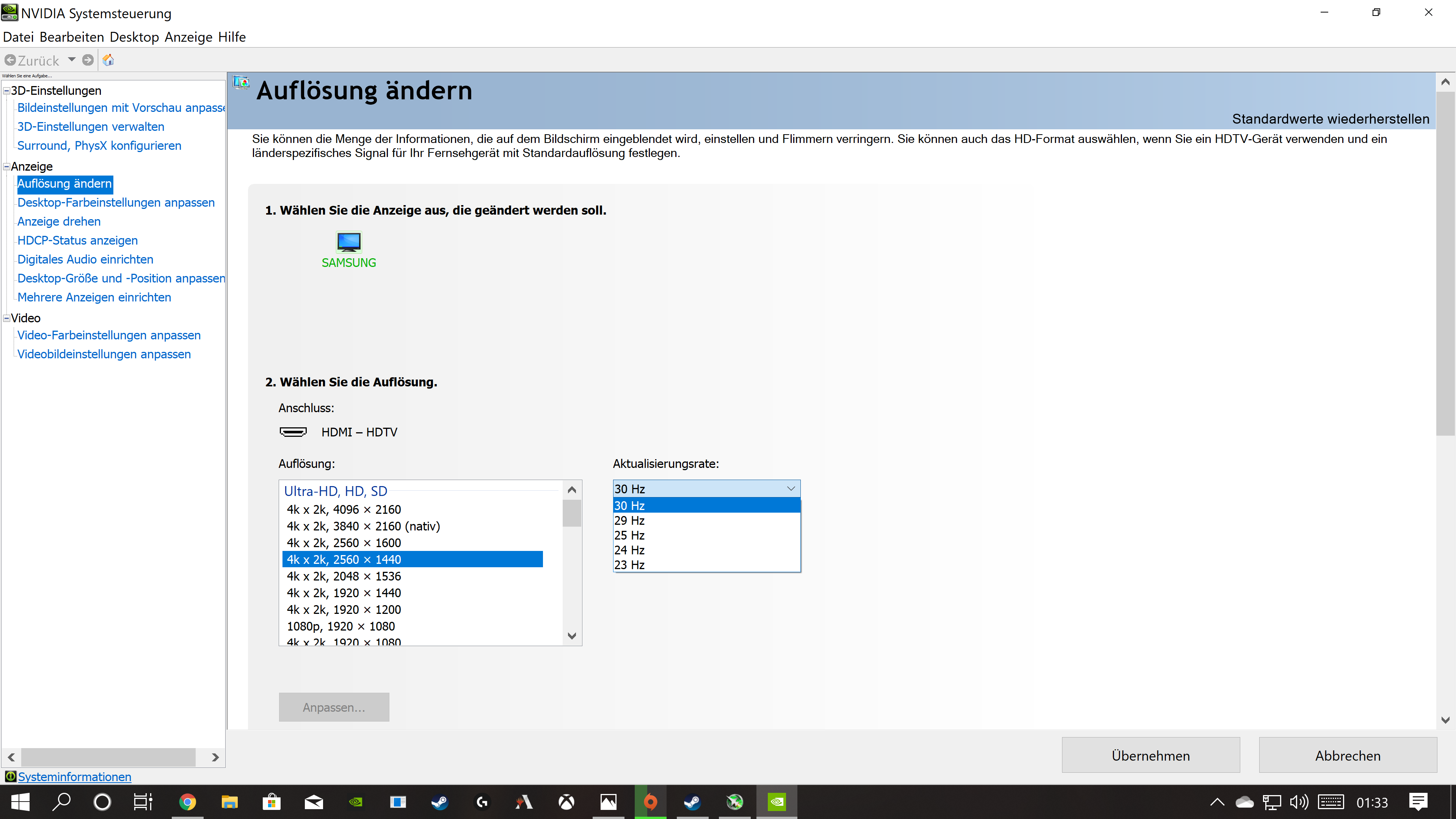 Also laut Handbuch S. 163 unterstützt Dein TV 120 Hz bei 2560 x 1440p. Und wenn ich mir deinen Screenshot vom nVidia Control Panel anschaue, dann bietet er doch zwei Einträge unter der nativen Auflösung doch 4k x 2k, 2560 x 1440 an. Wieviel Hz du dann daneben einstellen kannst musst Du schauen.