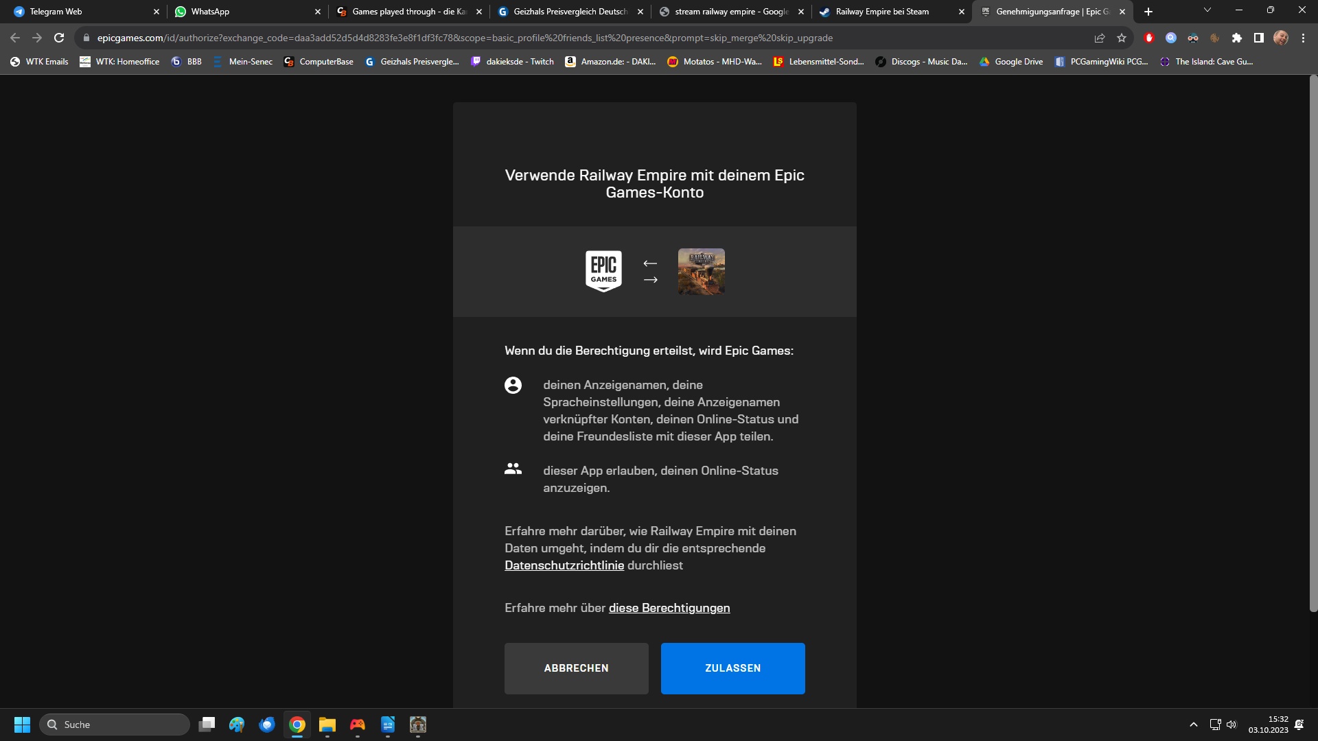 Eine weitere, technische Rafinesse ist das Verbinden des EPIC-Kontos mit dem Spiel. Vorweg: es muss KEIN neuer Account beim Spielehersteller angelegt werden und ich weiß auch nicht, ob sich die nachfolgend beschrieben Situation bei Steam genauso verhält. Bei EPIC, wo ich das Spiel kostenlos abgegriffen habe, wollte Railway Empire jedoch unbdingt, dass ich meinen EPIC-Account mit dem Spiel direkt verknüpfe. Das geht zum Glück mit wenigen Mausklicks. Andernfalls verweigert das Spiel die Möglichkeit zu speichern - sehr ärgerlich, wenn man es erst nach einiger Zeit des Spielens bemerkt.