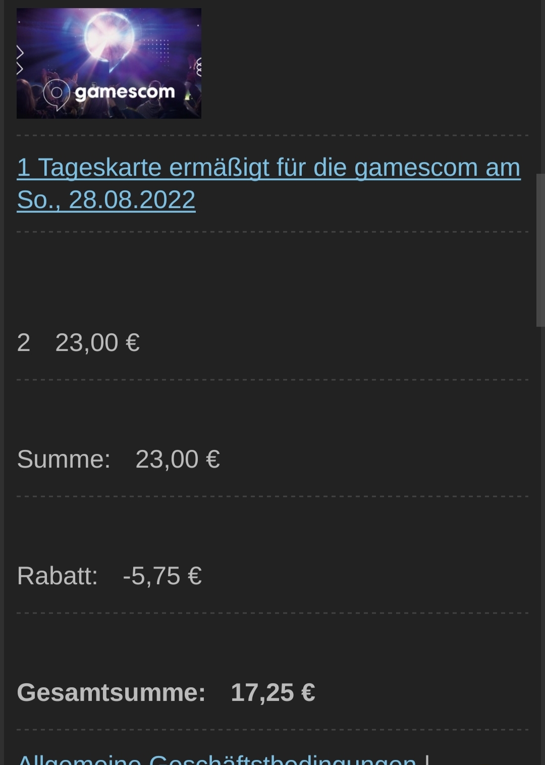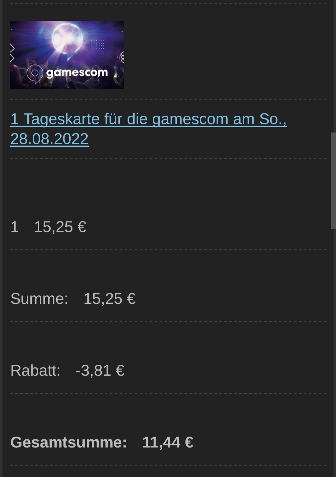 Vom 23. bis 27. August 2023 findet in Köln die Gamescom statt. Der Ticketverkauf ist heute gestartet. Die Tagestickets kosten 27 bis 36 Euro, ermäßigt ab 19,50 bis 28 Euro und als Abendticket (ab 16 Uhr) 9 bis 11 Euro. Familien mit drei Kindern von 7 bis 12 Jahren erhalten ab 60 Euro bis 75 Euro Zugang zur Messe.