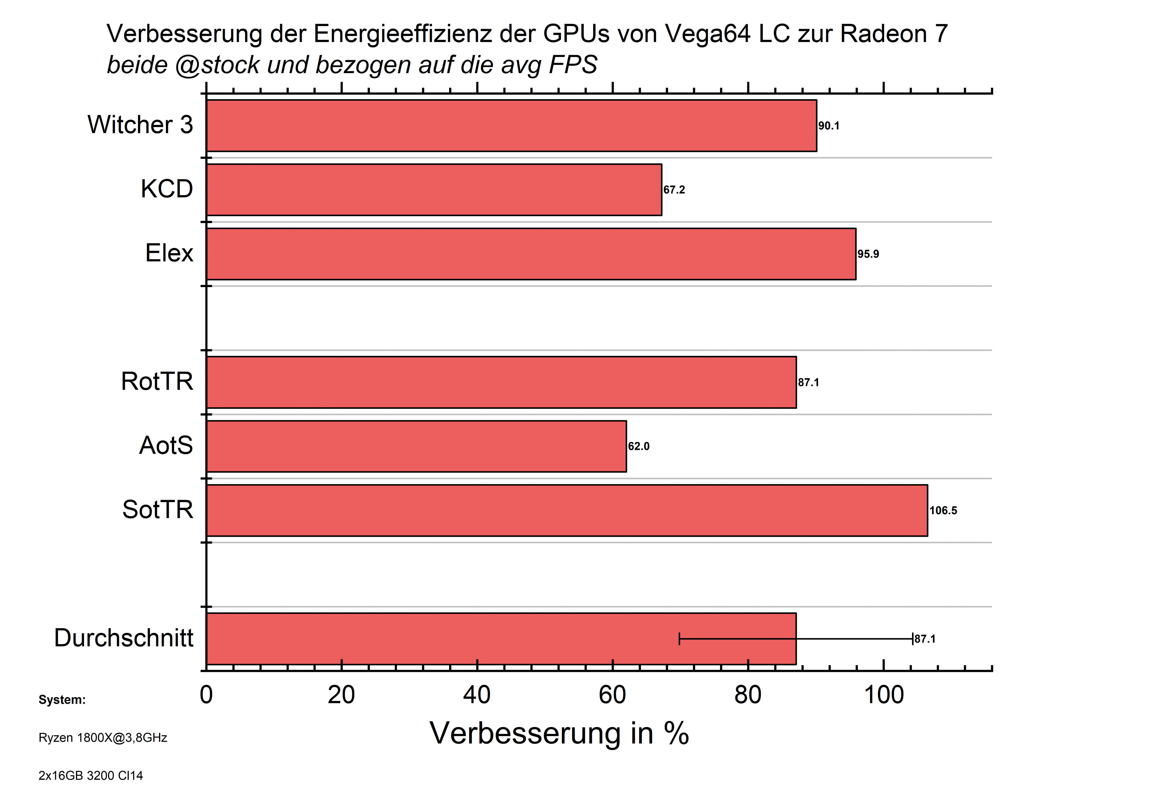 Guckt man sich jetzt die Effizienzverbesserung nur auf die Grafikkarten bezogen an, dann ist die Radeon 7 um 87,1% effizienter!