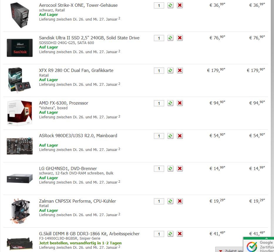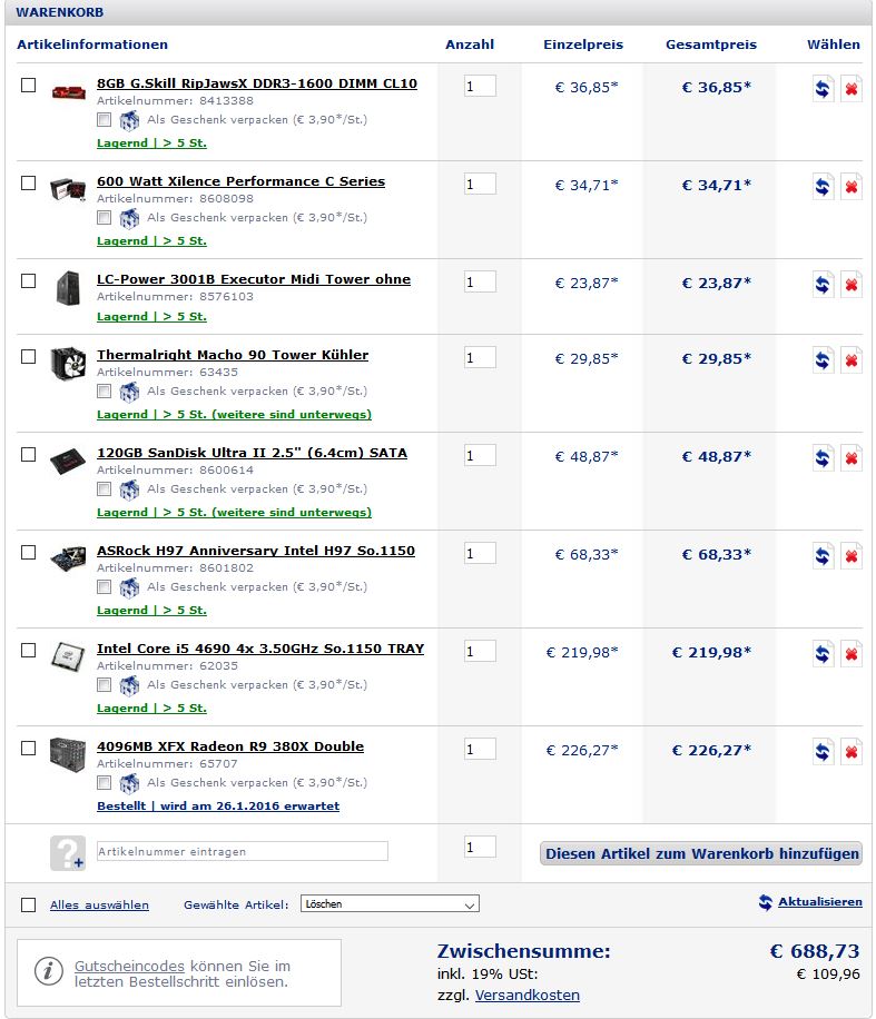 22 Zoll Full HD Monitor, 500Gb Festplatte, Gaming Maus/Tastatur, Gaming Headset und Lautsprecher habe ich noch bei mir rumliegen. Windows ist auch vorhanden. Die CPU wird nicht übertaktet. Zusammenbau übernehme ich.