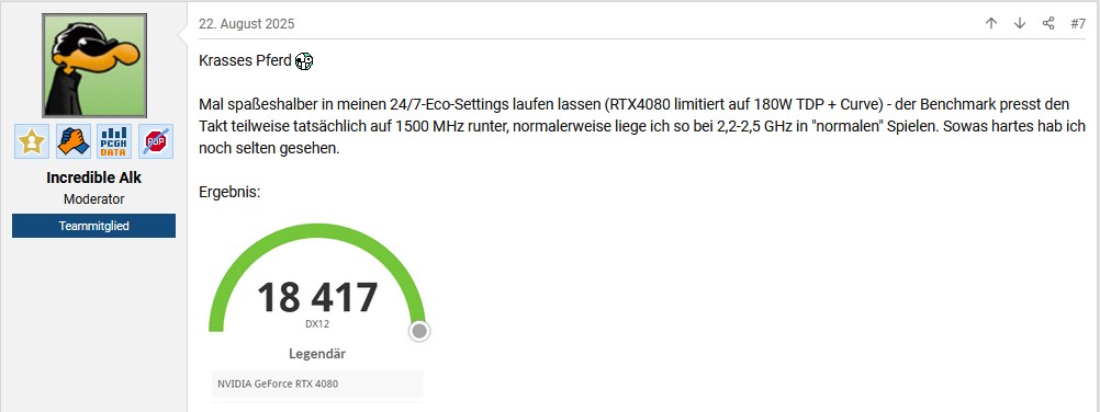 Wow, hätte nicht gedacht, dass so viele User 200+ Watt haben wollen. Gerade mal 20 % wollen weniger als 200 W. Meine 4070 Ti habe ich auf 70 % im UV Betrieb und erreiche damit fast dieselben Werte