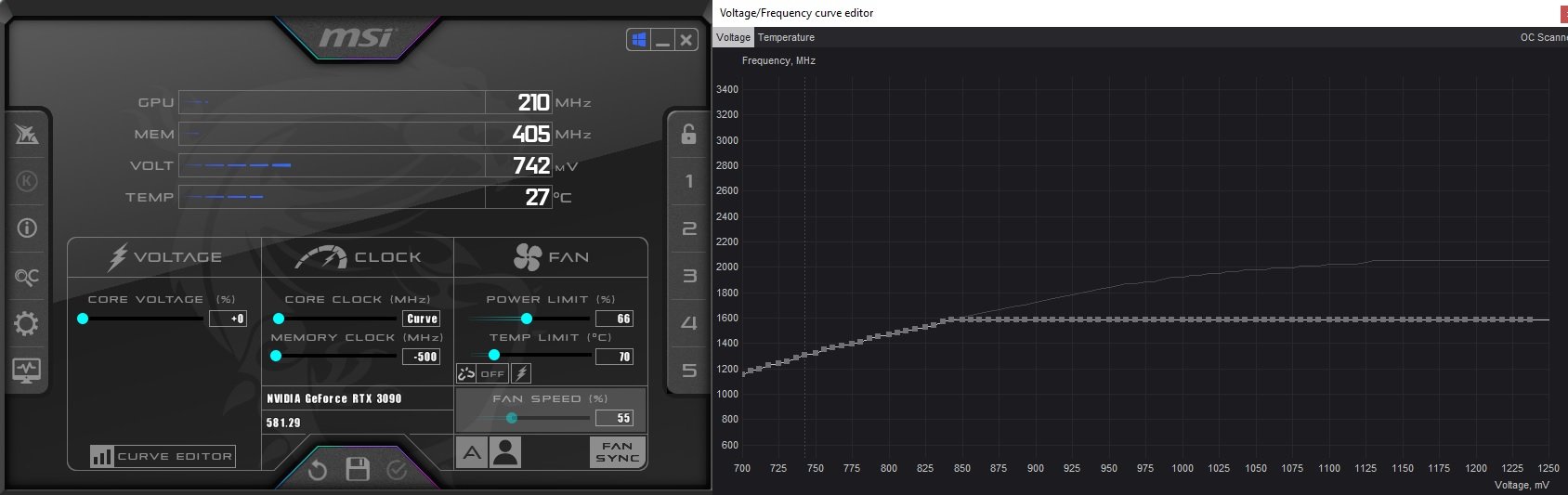 Ich hab mein auf 188W begrenz und komme damit meist um die 2700Mhz noch gut über die Runden ohne sehr viel Hitze/Lüfterdrehzahl und trotzdem mit RT und fast alle Settings max.