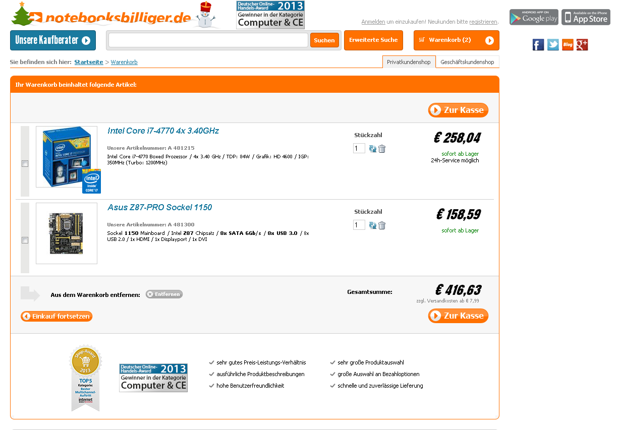 CPU: Intel Core i7 4770 Boxed. Kein 4770k, da ich nicht denke, dass ich übertakten werde. Kenne mich da gar nicht aus und es heißt ja sowieso, dass die Haswell CPUs auch ohne Übertakten sau heiß werden.