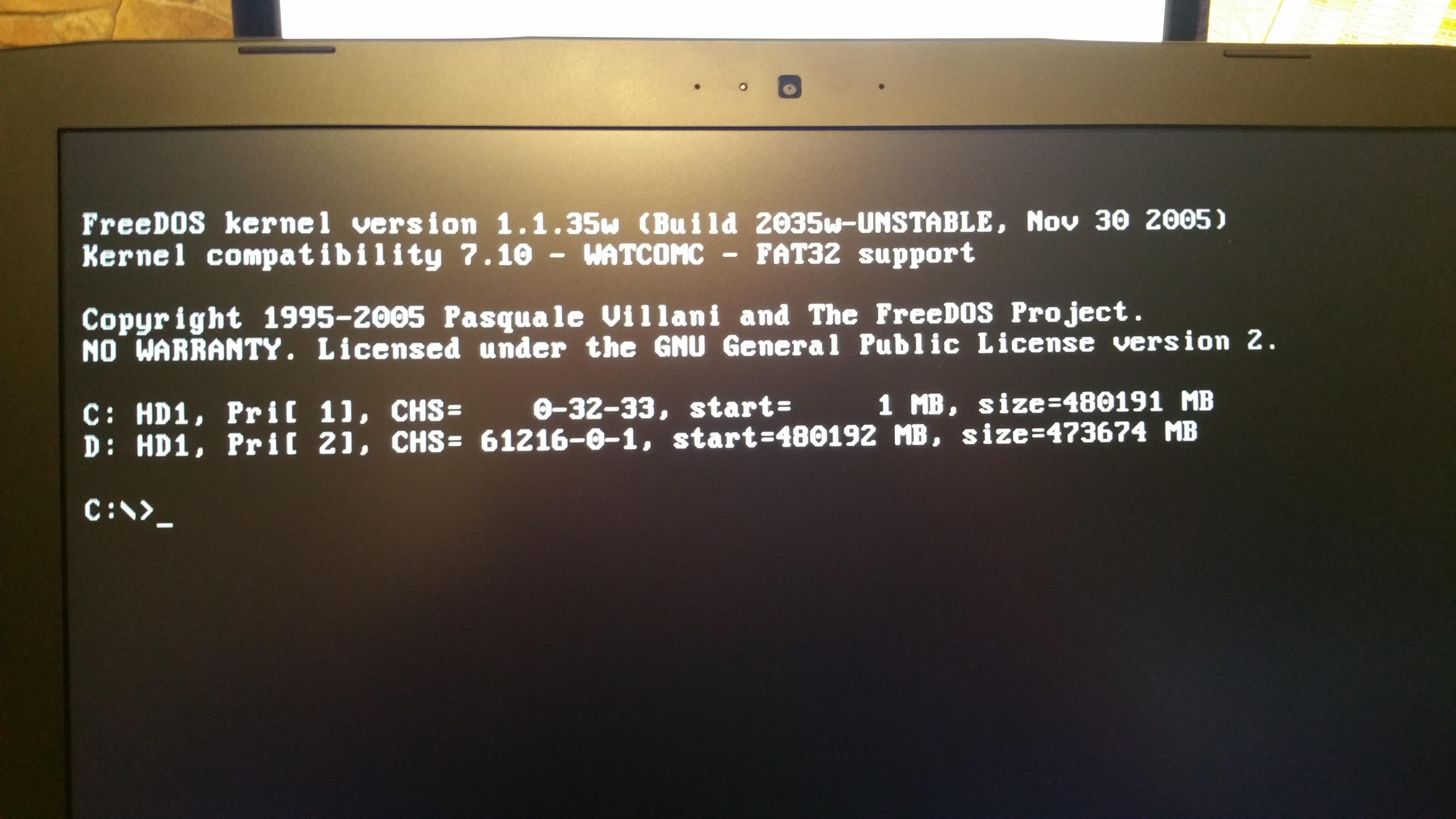 Windows gestartet. Es erscheint bloß ein Text dort steht FreeDos kernel version 1.1.35w usw.