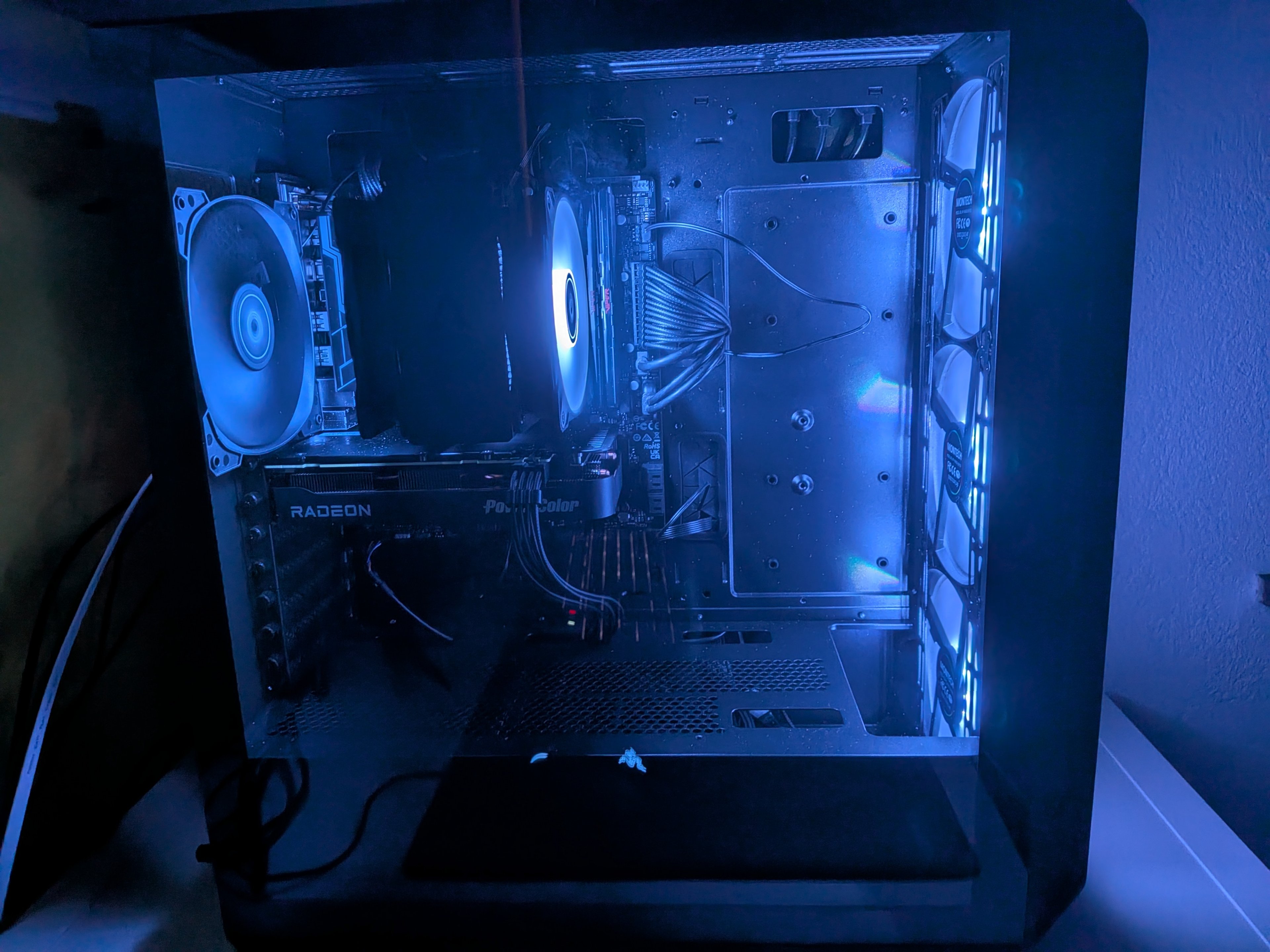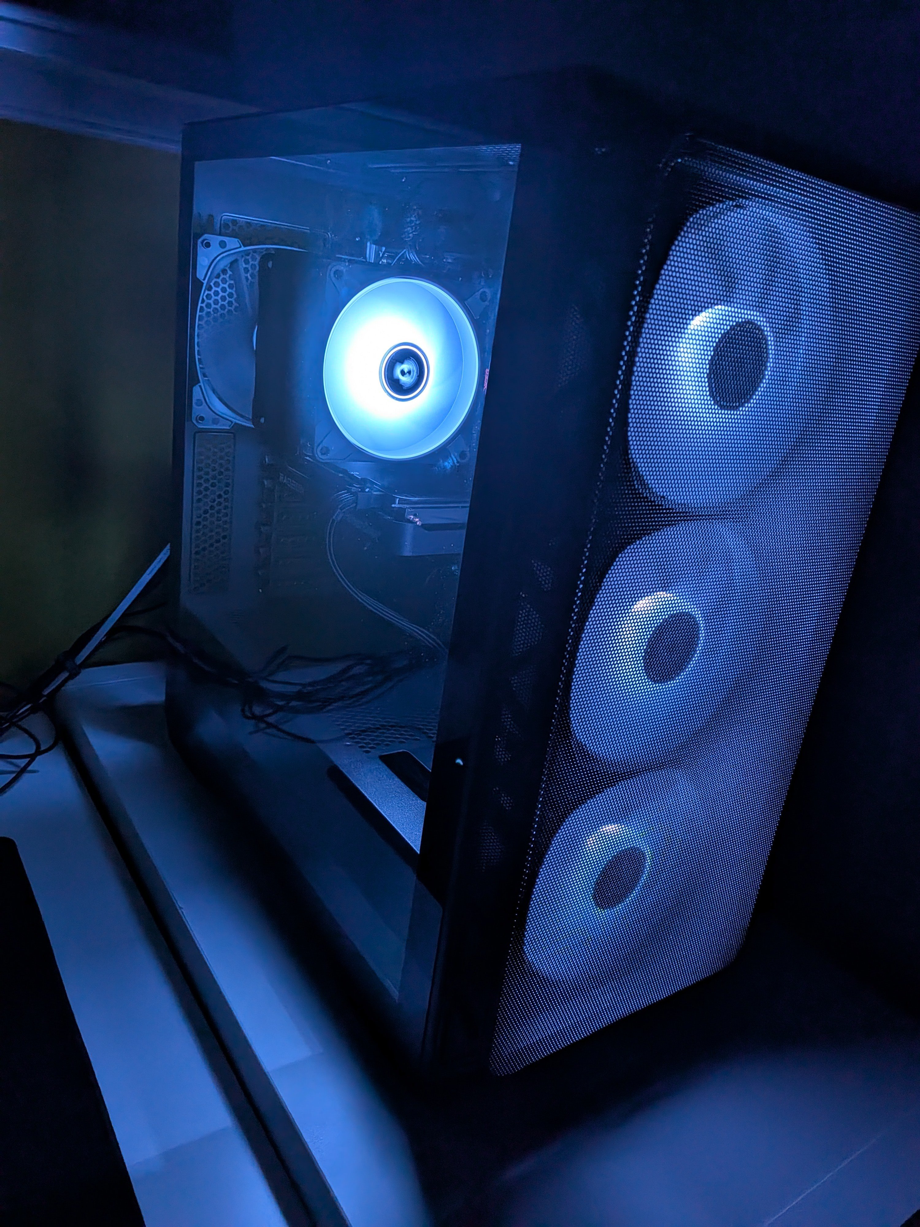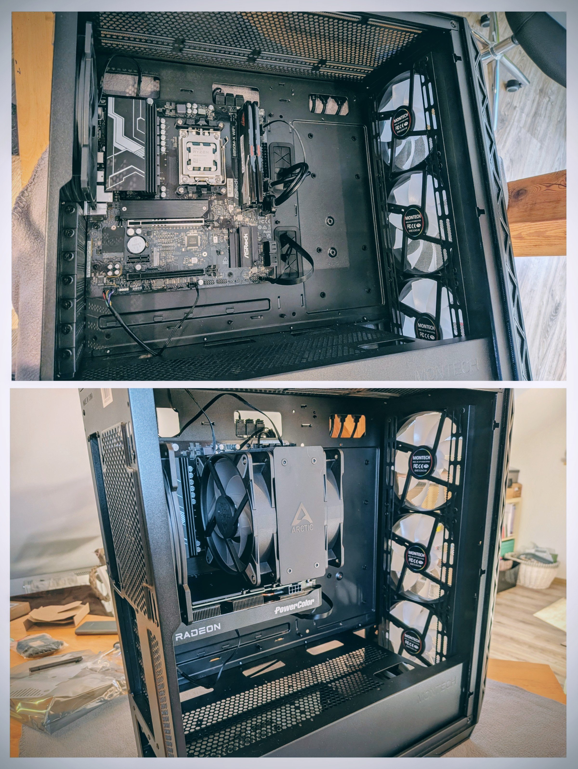Und das Beste, er funktioniert und sieht perfekt aus. Zusammenbau (Inkl. Test, Interne und externe Kabel verlegen & sortieren, perfekten PC Aufstellungsort ermitteln, Aufstellungsort/halbes Zimmer reinigen, Windows & Software installieren etc.) hat zwar einen halben Tag gedauert, das aber nur, weil wir es nicht eilig hatten und ich auch noch hier und da was erklärt habe (und auch selbst nochmal nachschauen musste, wie es geht).