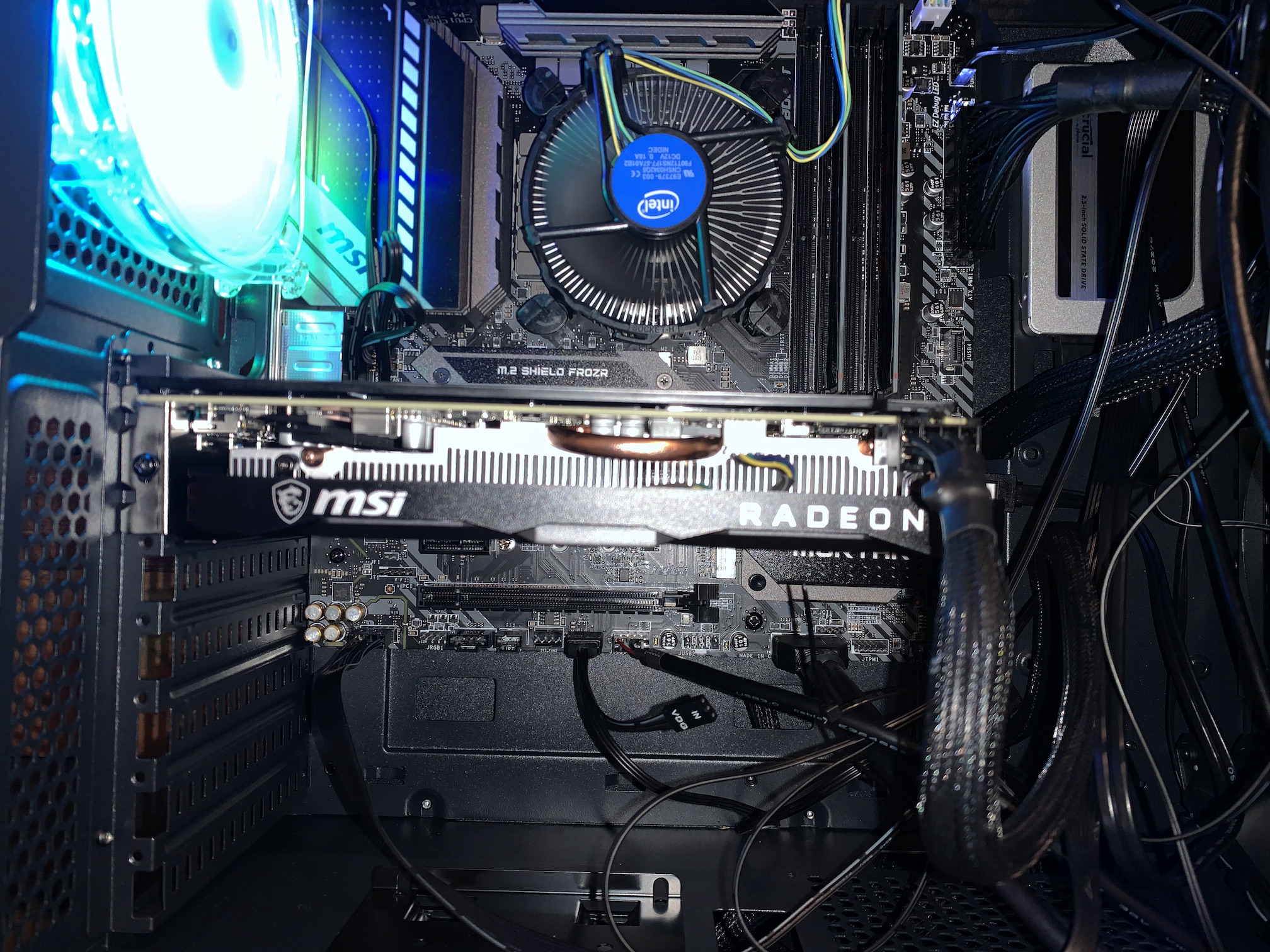 Um die GPU zu montieren, musst du zuerst die entsprechenden Slotblenden an der Gehäuserückseite entfernen; die GPU kommt dann in den, vom Sockel aus gesehen, ersten PCIe Slot und wird dort, wo die zuvor demontierten Slotblenden verschraubt waren, verschraubt. Am anderen Ende des PCIe Slots für die GPU gibt es einen kleinen Schnappmechanismus; der muss einrasten. Nicht auf die ggf. zusätzliche Stromversorgung der GPU vergessen.