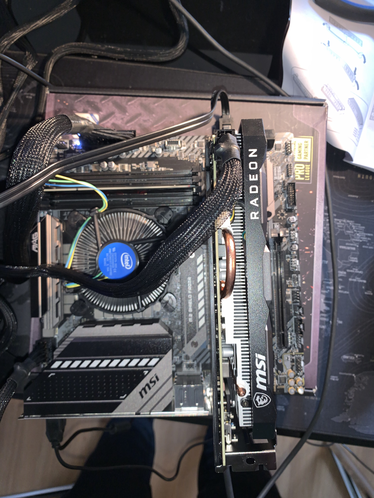 Ansonsten wär mein nächster Schritt, den Aufbau mal ausserhalb des Gehäuses zu machen um zumindest sicherzustellen, dass es nicht an Schrauben/Abstandhalter liegt. Die Oberseite der Mainboardschachtel eignet sich hierfür beispielsweise, da nicht leitend.