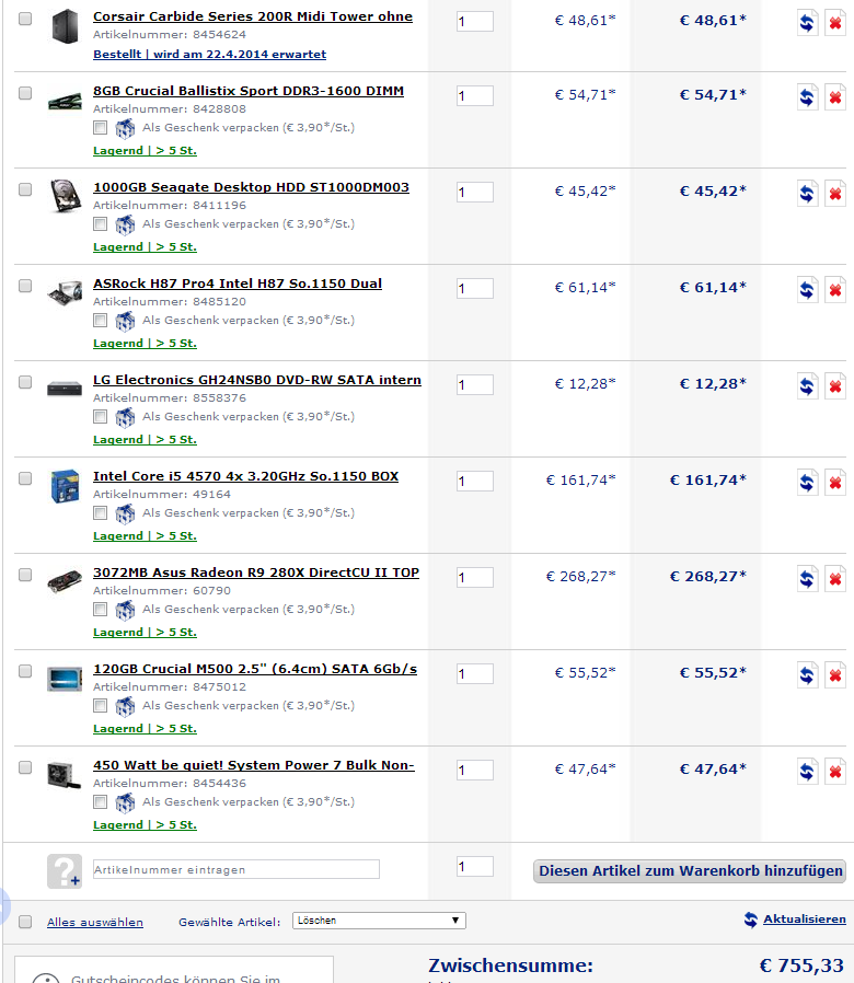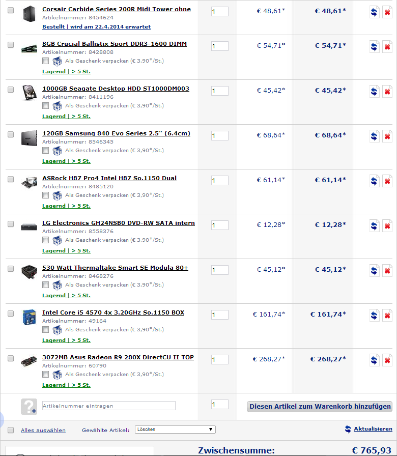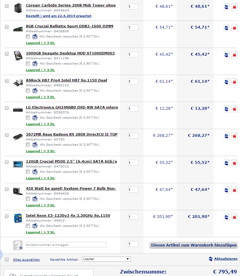 Im Grunde habe ich mich soweit schon etwas schlau gemacht und die meisten Rechner in dem Budget sind ja doch alle rel. gleich aufgebaut. Ich habe mir hier aber mal 2 Rechner zusammengestellt, wobei sich mir die Frage stellt, ob ich den Intel Xeon E3-1230v3 Box oder den Intel Core i5 4570 BOX nehmen sollte. Übertakten möchte ich nicht!!