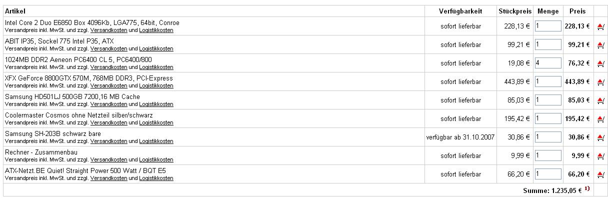Also, bei Alternate.de hab ich mir folgenden Rechner zusammengestellt. Ich möchte dazusagen, dass ich das System später der Geräuschentwicklung mit Wasserkühlung aufrüsten möchte und im Prinzip ein Laie bin, was irgendwelche Taktfrequenzen etc. angeht. Das als Vorwort.
