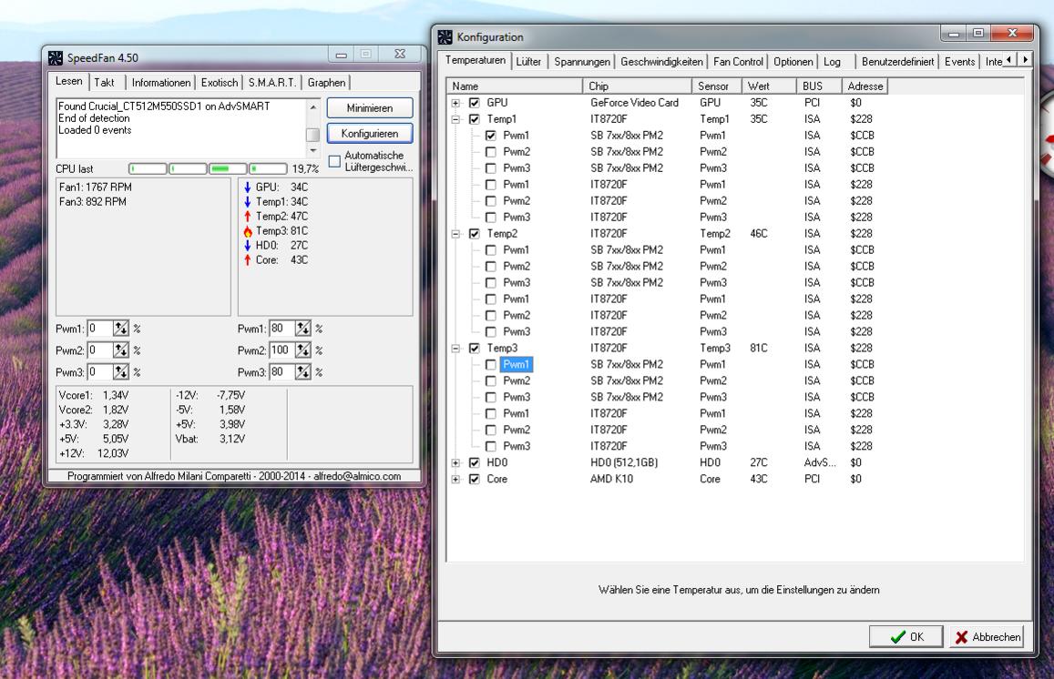Mein Gehäuse hat oben einen großen 200mm Lüfter drin, den ich aber zugunsten des Kabelmanagements abgeschaltet habe, vllt schalte ich den mal besser wieder ein. Bei Speedfan wird mir folgendes angezeigt: