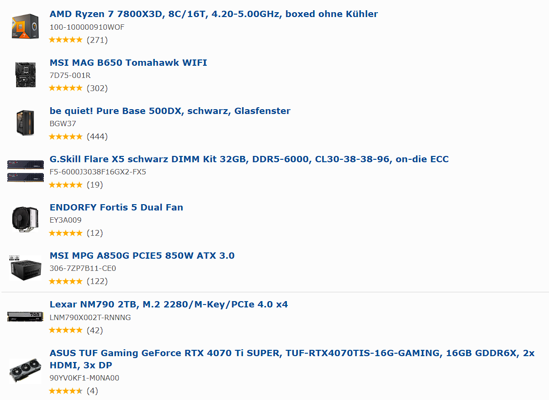 ich habe vom angepinnten Thread "Der Ideale Gaming-PC: Spiele-PC selbst zusammenstellen" die meisten Komponente übernommen, lediglich das Motherboard, Grafikkarte und das Gehäuse abgeändert.
