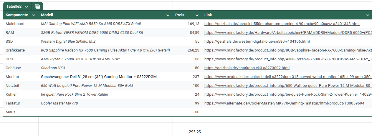 ich habe folgendes System zusammengestellt. Wichtig war mir AM5. Bei der Grafikkarte würde ich eventuell eine RX 7600 XT nehmen. Wo seht ihr hier noch Einsparpotential? Oder Probleme bei den Komponenten? Und ja, der Auftraggeber (meine Frau) wünscht explizit diese Tastatur