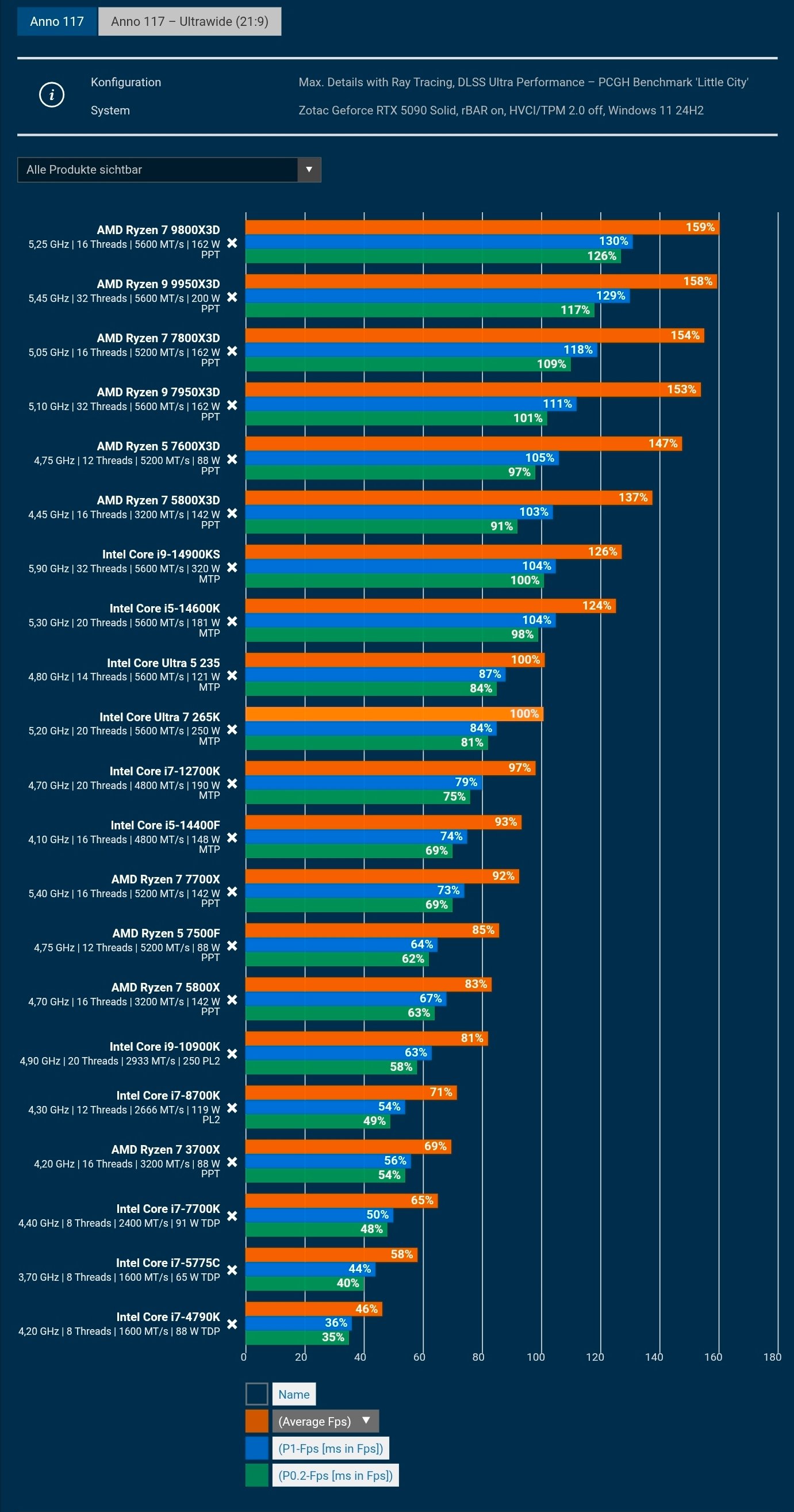 Ich spiele die Anno-Reihe seit Anno 1602. Außer dem Anno 2205 habe ich alle Reihen in mindestens vierstelliger Stundenzahl durchgespielt. Ich frage mich deshalb, was die Anno-Reihe mit allgemeinen Benchmarks zu tun hat? Auch Anno 1800 und Anno 117 sind Aufbau- und Strategiespiele, die eben nicht von einem X3D-Cache profitieren, weil hierbei 30 bis 60 FPS genügen. Selbst im Endspiel bei Anno 1800. Je größer die Auflösung, desto mehr Kerne. Aber sonst... außer einer Grafikkarte von Nvidia?
