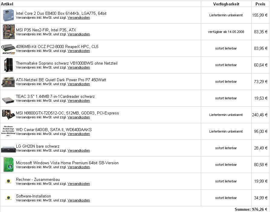 2. Boxed-Kühler beim E8400 ist ohne übertakten ausreichend. Außerdem bekommst du dadurch dass du ihn Boxed kaufst, 3 Jahre garantie (und mit sicherheit einen nagelneuen) wobei dir dir bei Tray nicht garantiert wäre.
