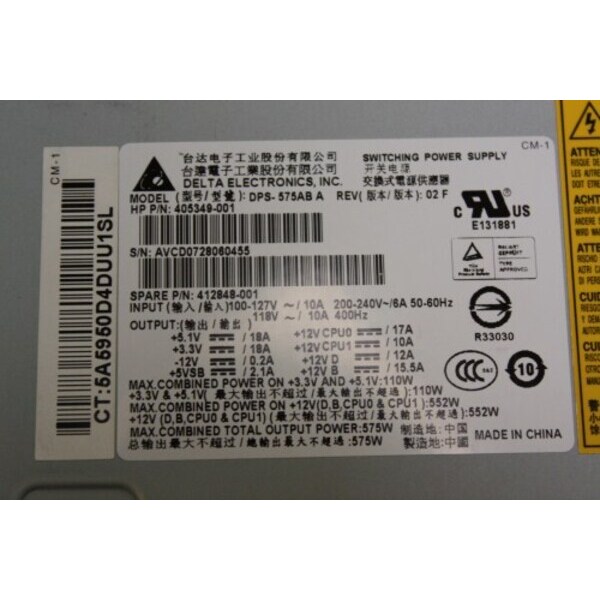 - Netzteil: Delta Electronics Inc. Model: DPS- 575AB A Max Output: 575Watt