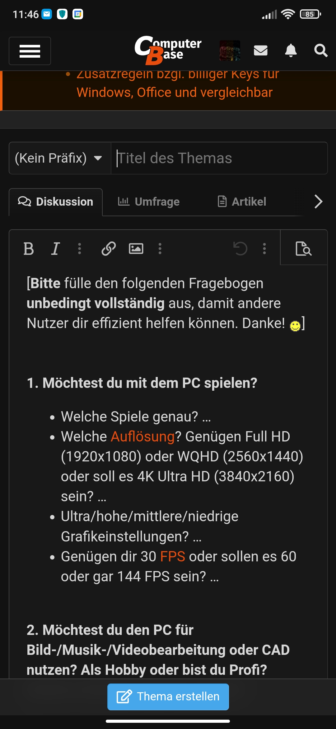 [Bitte fülle den folgenden Fragebogen unbedingt vollständig aus, damit andere Nutzer dir effizient helfen können. Danke!
