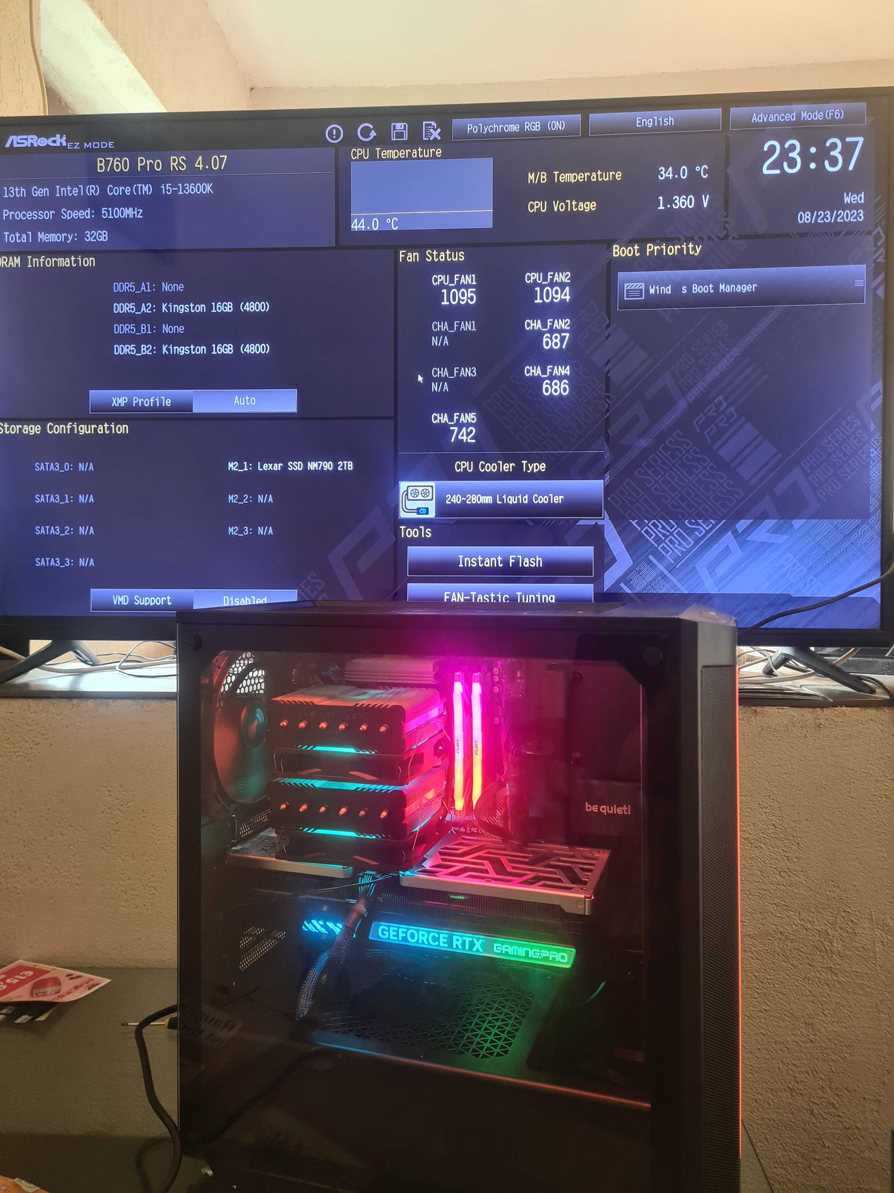 ... du musst noch das XMP Profil aktivieren (von "Auto" auf "XMP Profil" schalten und beim Verlassen des BIOS diese Einstellung mit >F10< speichern) und der CPU Kühler ist falsch herum eingebaut. Den musst du einmal in Pfeilrichtung um 90 Grad drehen (siehe blauer Pfeil am Bild). Das ist nötig, weil: der/die Frontlüfter befördern kühle Luft ins Gehäuse, diese kühle Luft wird vom ersten und in weiterer Folge vom zweiten Lüfter am CPU Kühler durch die Kühlrippen des CPU Kühlers geblasen. Dadurch wird die CPU gekühlt und die dabei erwärmte Luft wird von Lüfter an der Gehäuserückseite wieder aus dem Gehäuse hinaus geblasen. So wie du den CPU Kühler montiert hast, funktioniert das nicht bzw. nur sehr eingeschränkt und die CPU wird heißer als nötig.