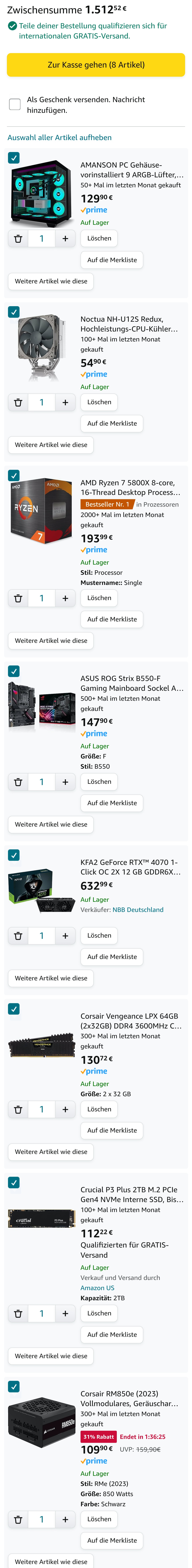 Ich möchte mir einen neuen Gaming PC Zusammenstellen. Da ich kein Experte bin, was die Komponenten angeht, dachte ich mir, dass ich hier Mal nachfrage, ob das Quatsch ist, was ich zusammengestellt habe, oder ob's halbwegs passt.