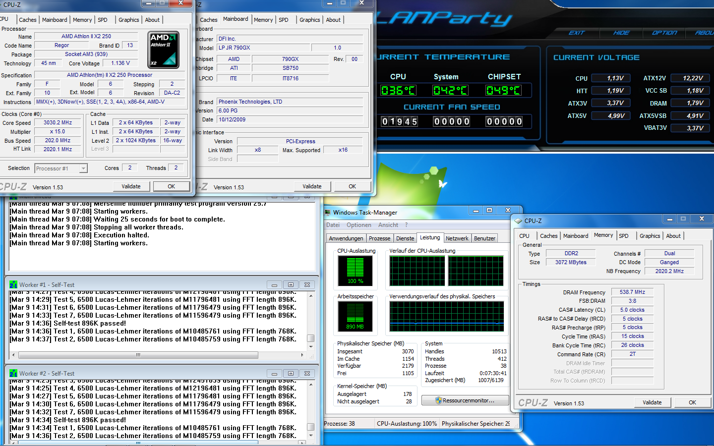 Natürlich schwanken die Spannungen je nach Belastungsgrad, z.B. beim Booten. Das ist bei DFI nicht anders, nur da kaschiert der V-Sensor die nicht relevanten Änderungen.Das AM3 Schwankt von der Spannung her je nach hochfahren mal so mal so,CPU um 0,025V und die Speicher um 0,04V.Wenn die Spannungen Spinnen hab ich oft auch BS.