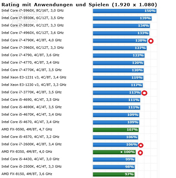 Intels i7 4790K hat dieselbe Anzahl Threads und denselben Takt, hat im Mittel 28% Vorsprung, dafür kostet er das doppelte und ist anderthalb Jahre jünger.