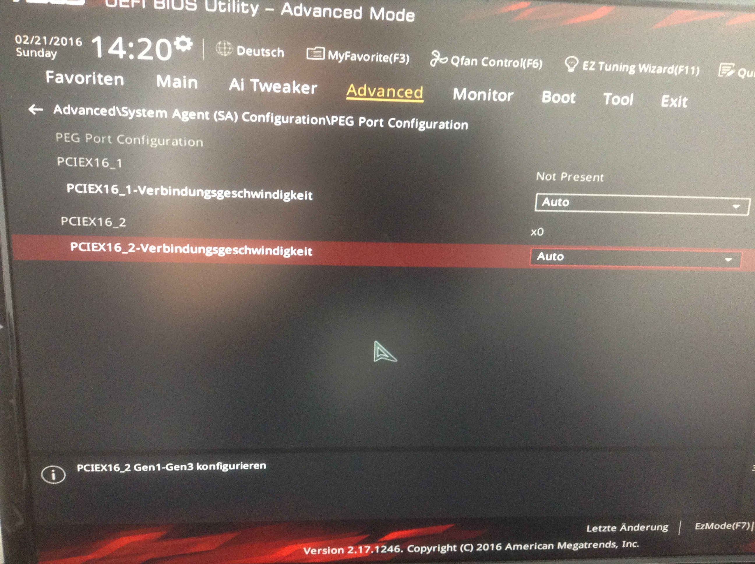 Um diese Einstellungen besser zu verstehen, habe ich aus meinem alten PC die Grafikkarte ausgebaut, und im neuen Computer wieder eingebaut. Siehe da, die Karte wurde erkannt und mit 16 Lanes direkt angebunden.