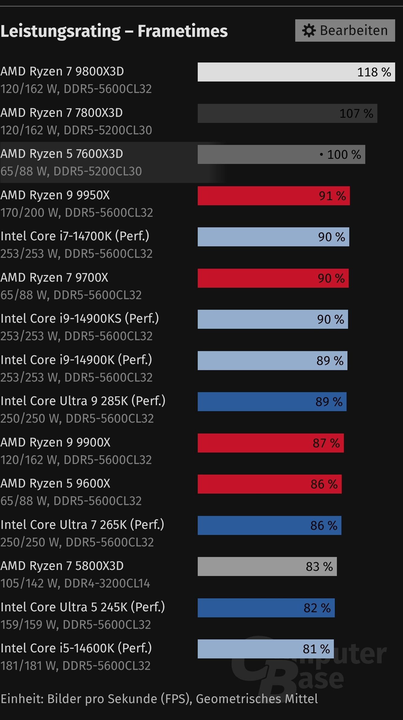 Ich will den 7600X3D nicht schlecht reden, ich habe die CPU selbst schon häufig für Systeme empfohlen, bei denen Gaming im Fokus steht und auch selbst schon 2x verbaut und getestet. In diesem konkreten Fall würde ich dem TE jedoch empfehlen eine CPU der aktuellen Generation zu kaufen, d.h. AMD Ryzen 9000 oder Intel Core Ultra. Der 3D ist als Zusatzoption zu sehen und kostet einen fetten Aufpreis, ohne einen Vorteil in Anwendungen zu bringen.