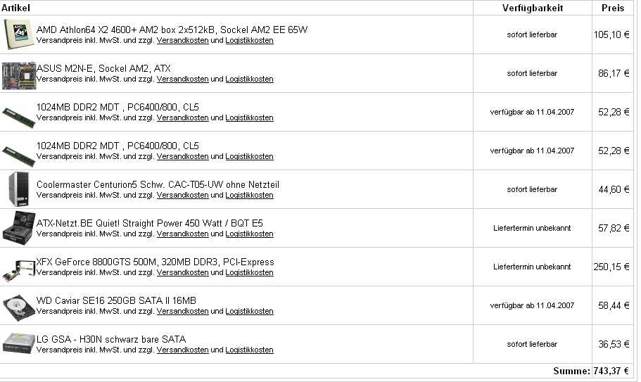 Komplett sähe das dann so aus: da bist mit dem 4600+ noch nen stück unter deinem limit, alternativ wäre dann der 5200+ mit dem du dann inkl Arctic Freezer64 auf 815€ kämst.