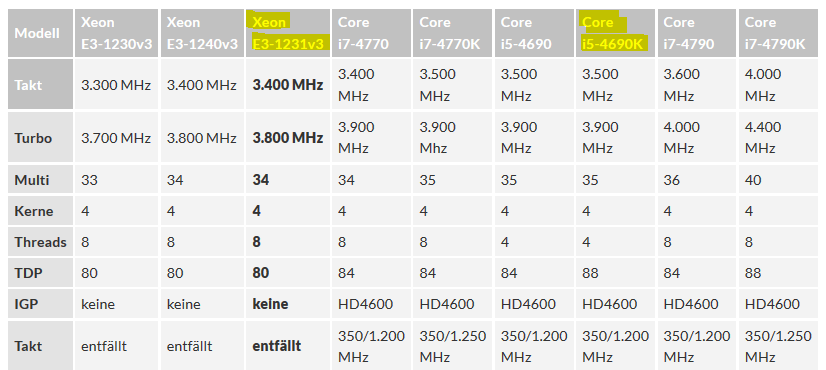 Ich schwanke nämlich zwischen dem Xeon-E3-1231-v3 und dem i5-4690K.